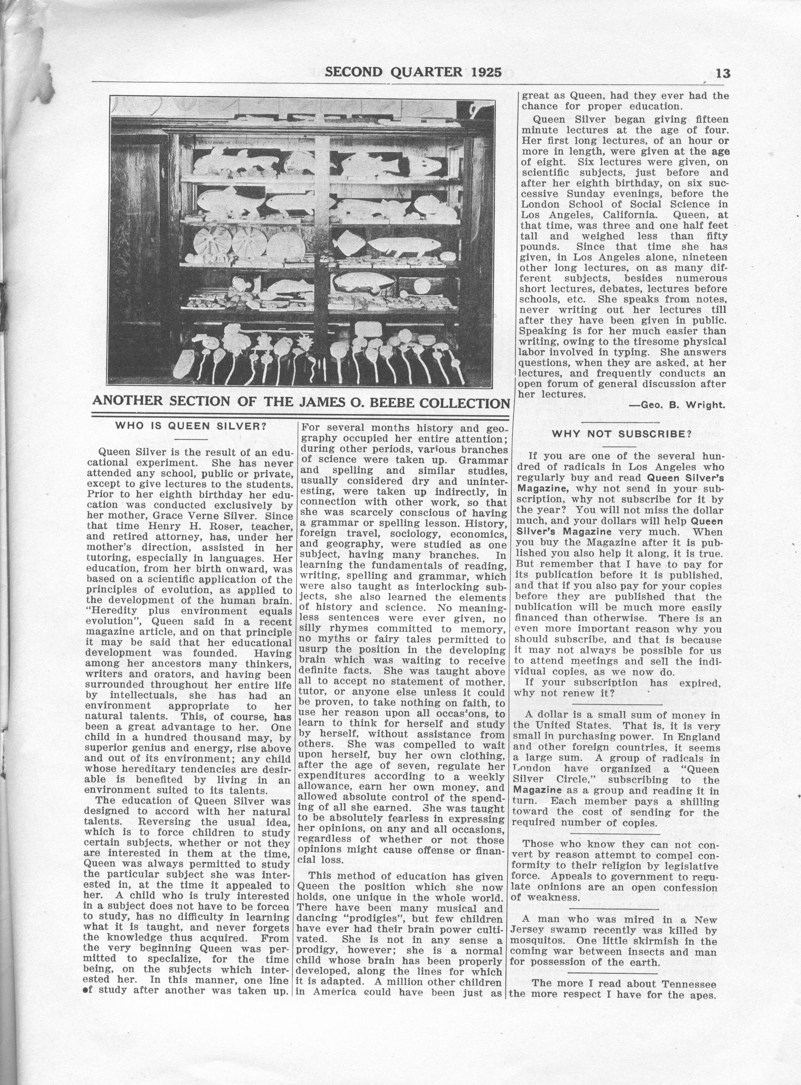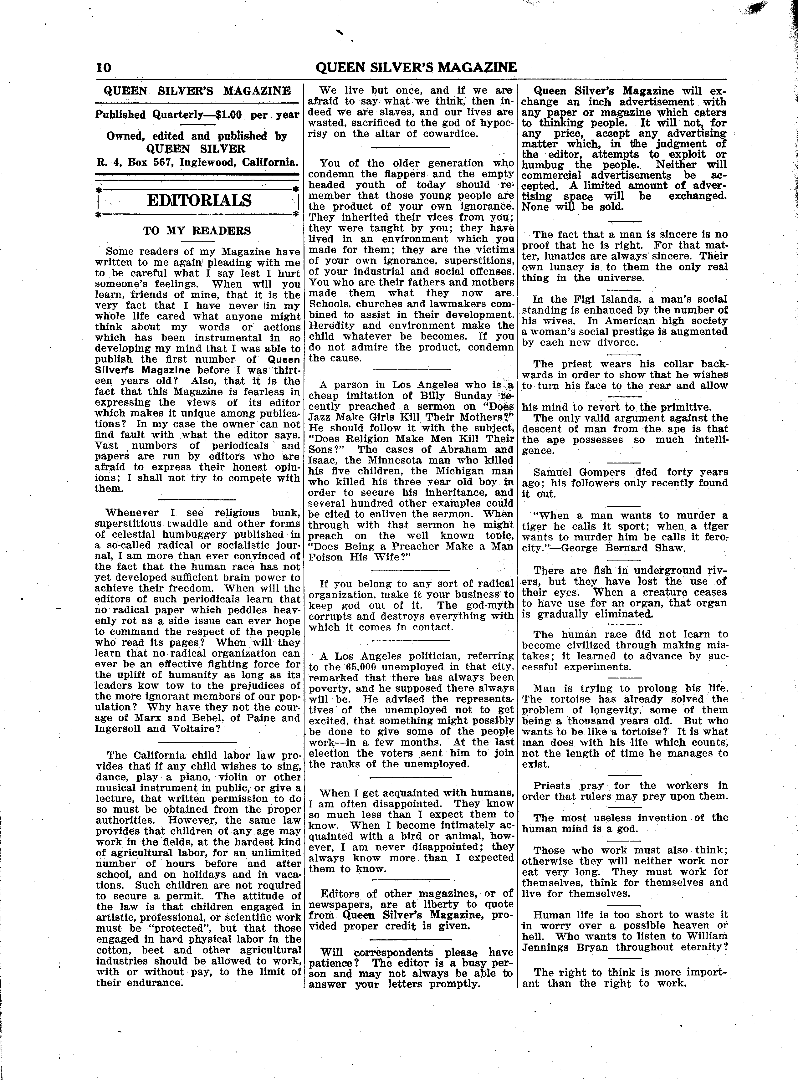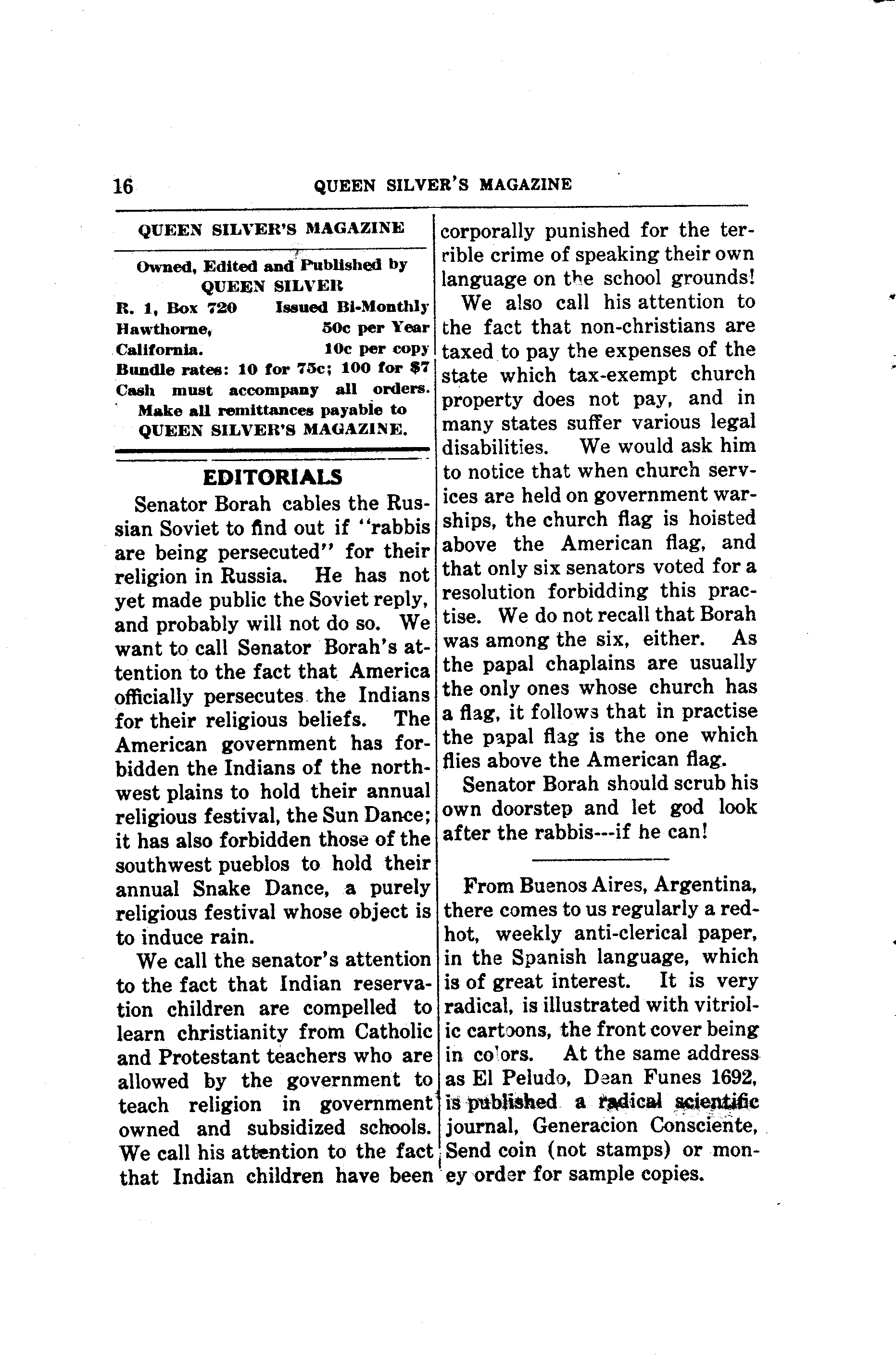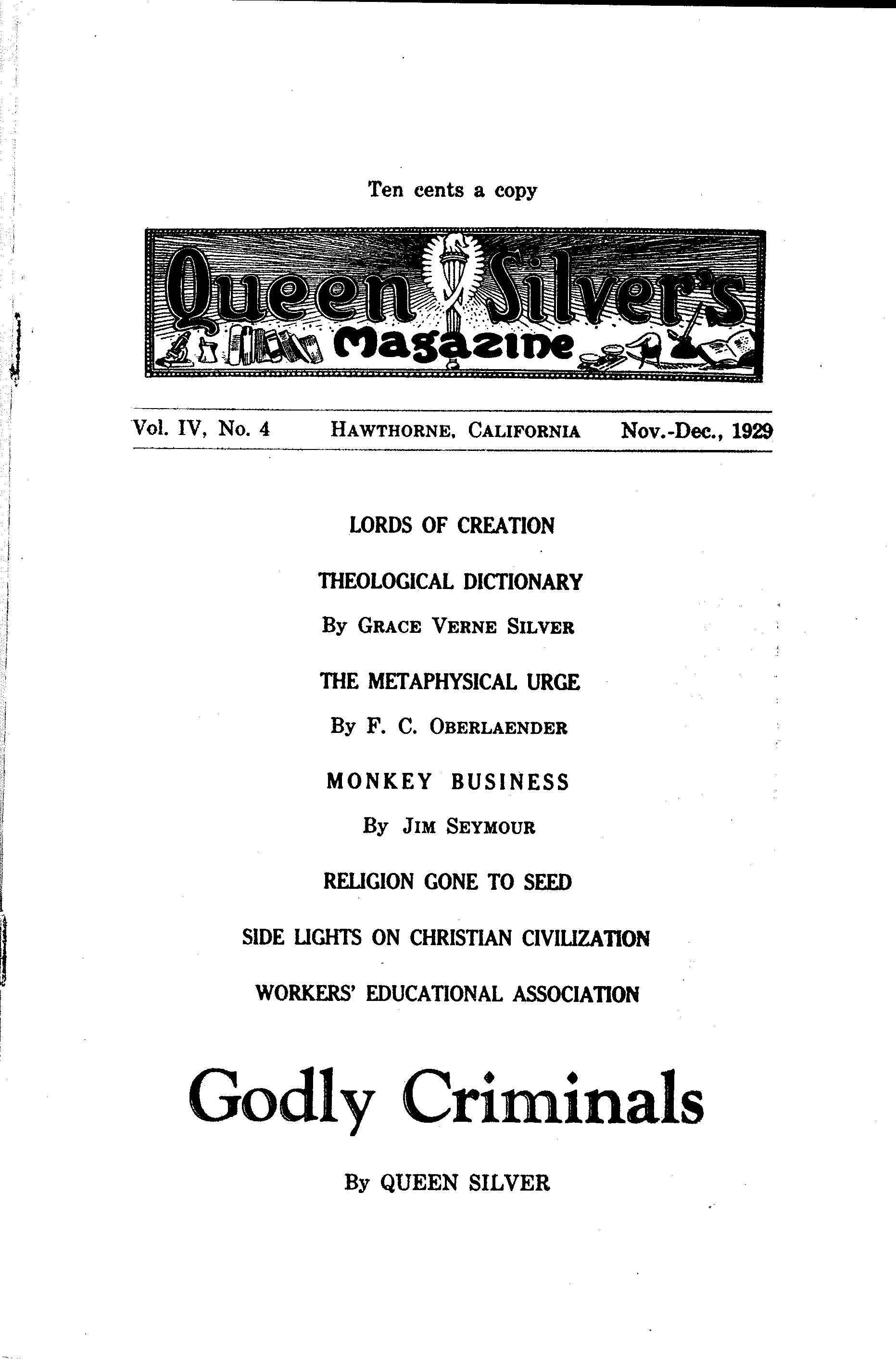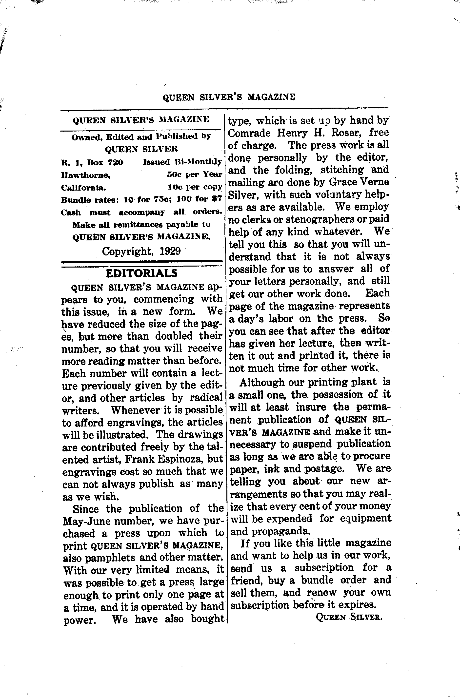 Selected issues of Queen Silver's Magazine have been scanned and converted to Adobe PDF files. Others are available, page by page, as raw scans (PNG images).
