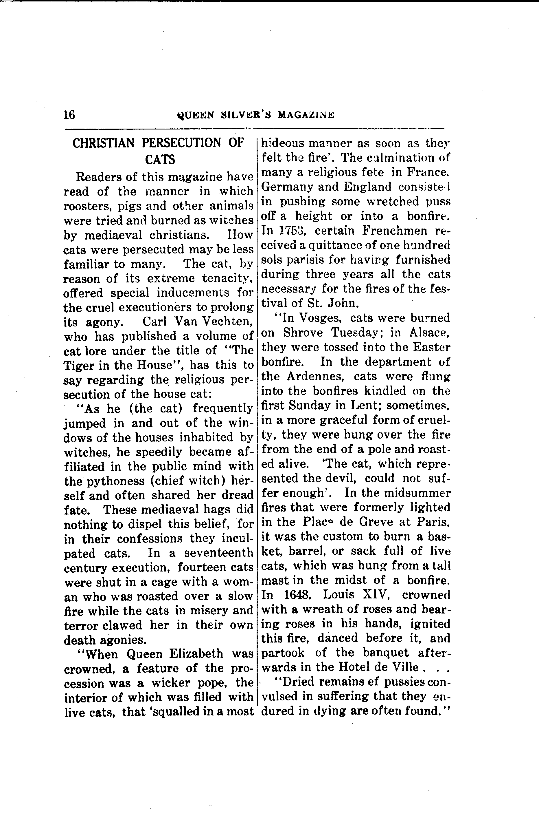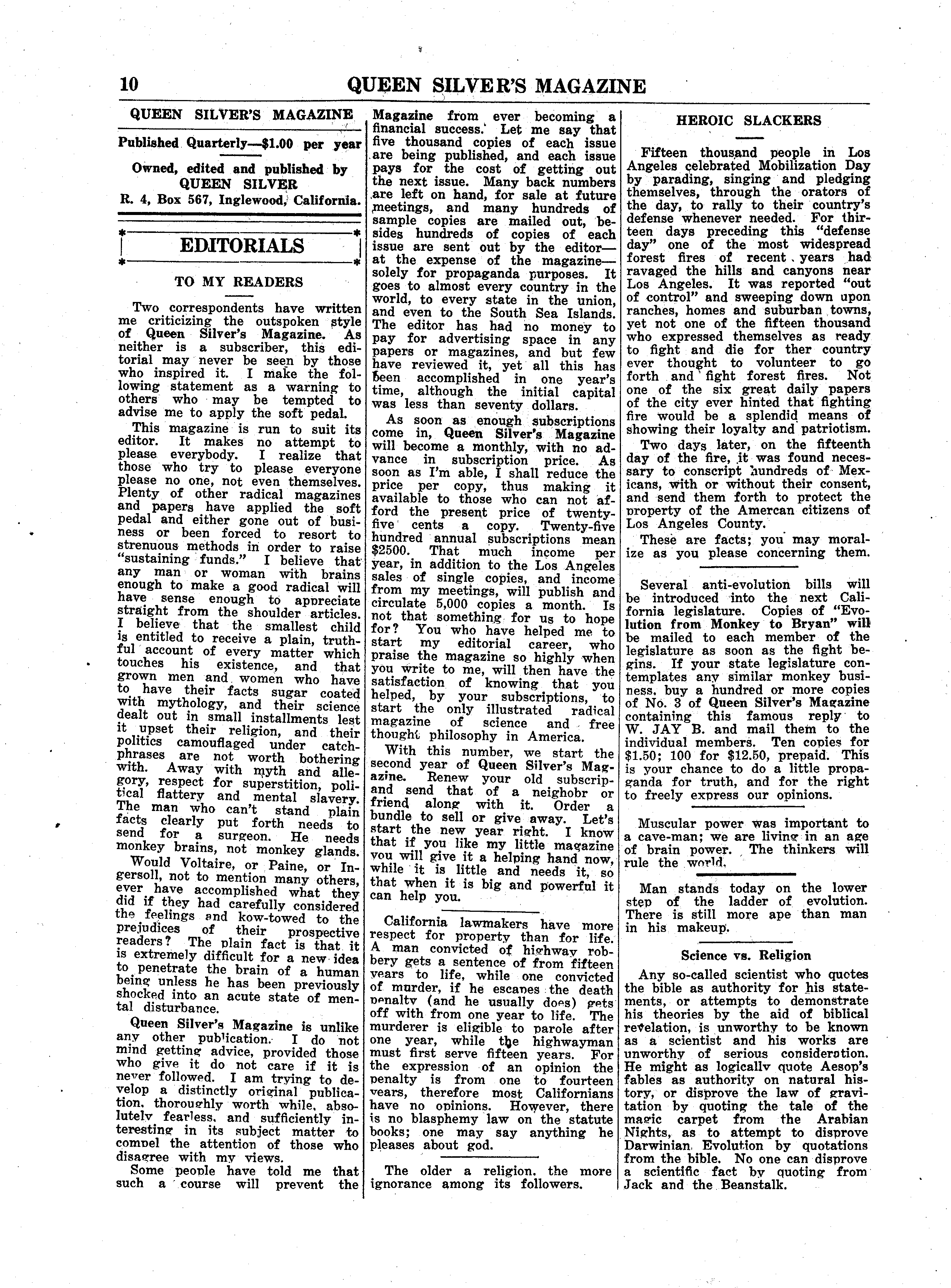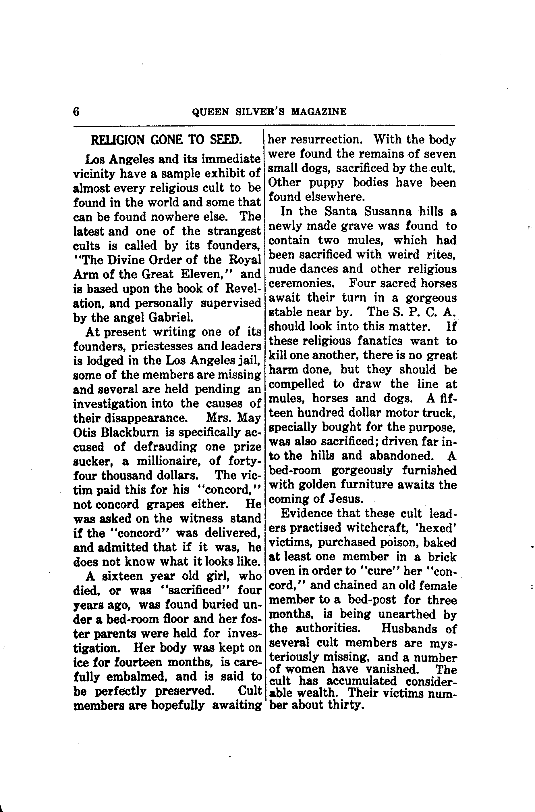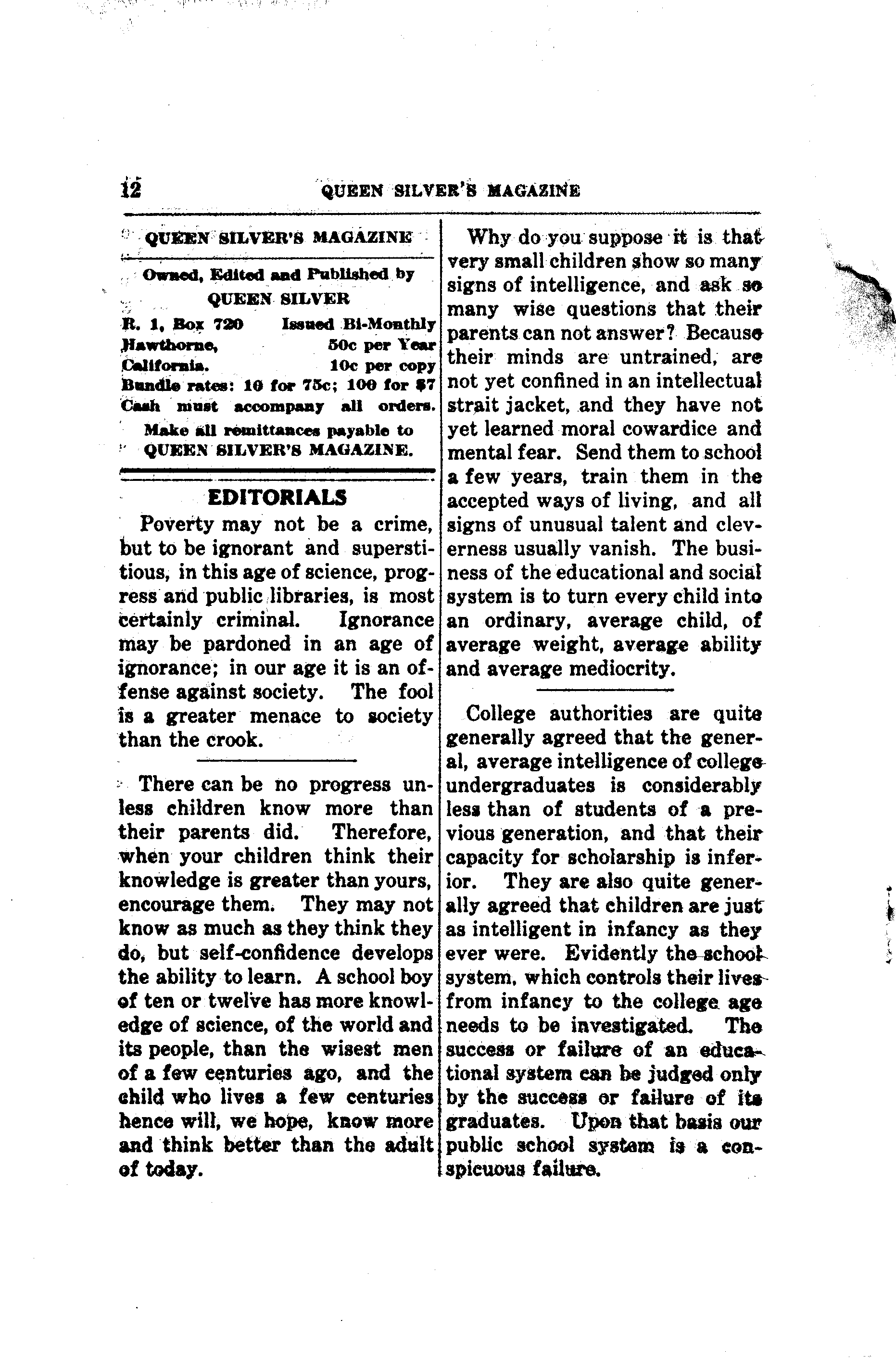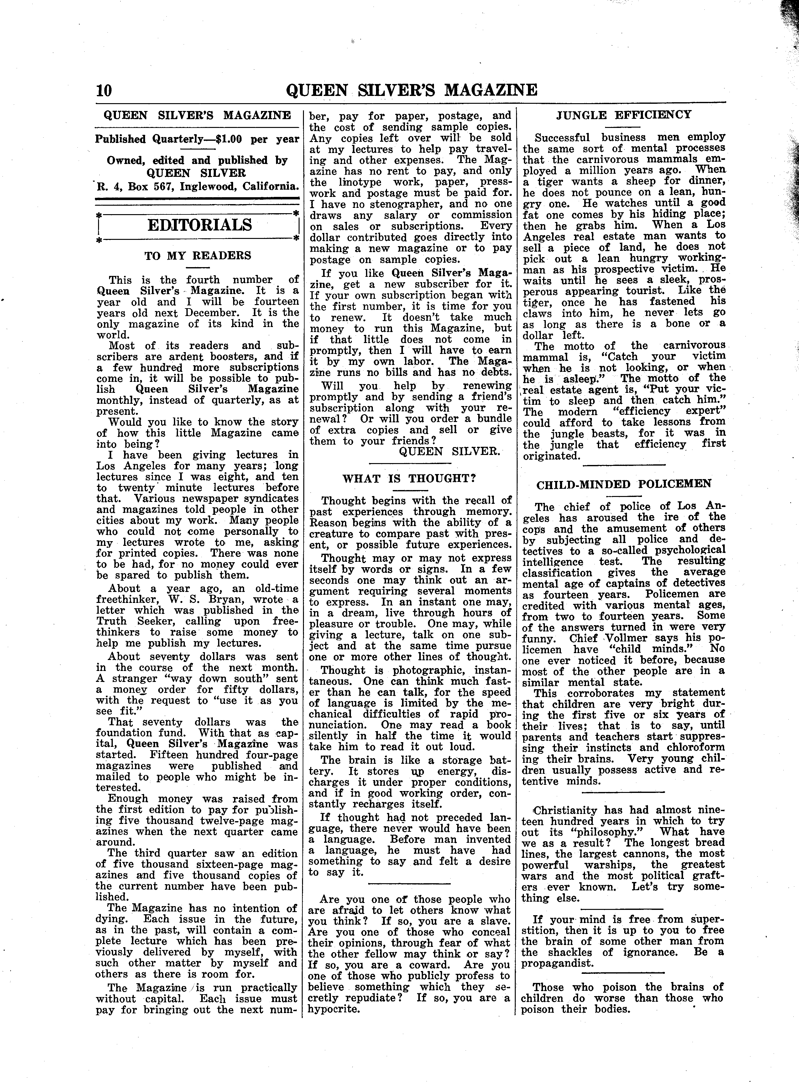 Selected issues of Queen Silver's Magazine have been scanned and converted to Adobe PDF files. Others are available, page by page, as raw scans (PNG images).